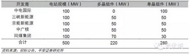根据我国首个“领跑者”计划示范项目大同采煤沉陷区先迚光伏技术示范基地的招标情况,单晶受益明显,据不完全统计,在1GW示范项目中单晶组件的采购量至少达到280MW(若剔除拥有上游产业链具备多晶组件生产能力的开収商,示范项目中纯运营商采购的单晶组件占比至少达40%)。