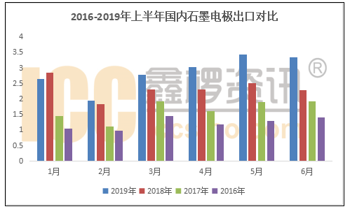 从量上来看,2019年1-6月国内石墨电极月均出口量高于过去三年,尤其是今年,出口量增量非常明显,可见近两年中国石墨电极在海外市场出货量呈现上升趋势。