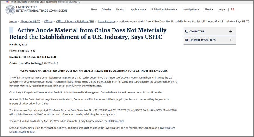 2026年3月12日,美国国际贸易委员会(USITC)表示,来自中国的活性负极材料并未实质性地阻碍美国负极产业的建立。
